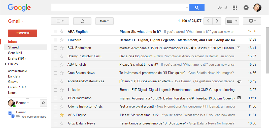 Ep, què és el Menú desplegable al costat de Gmail en vermell? Ah, sí, allà hi ha els contactes. I les tasques que ningú fa servir. Ja que us heu atrevit a posar la resta de serveis al menú de la dreta, atreviu-vos també amb això i així fem net.