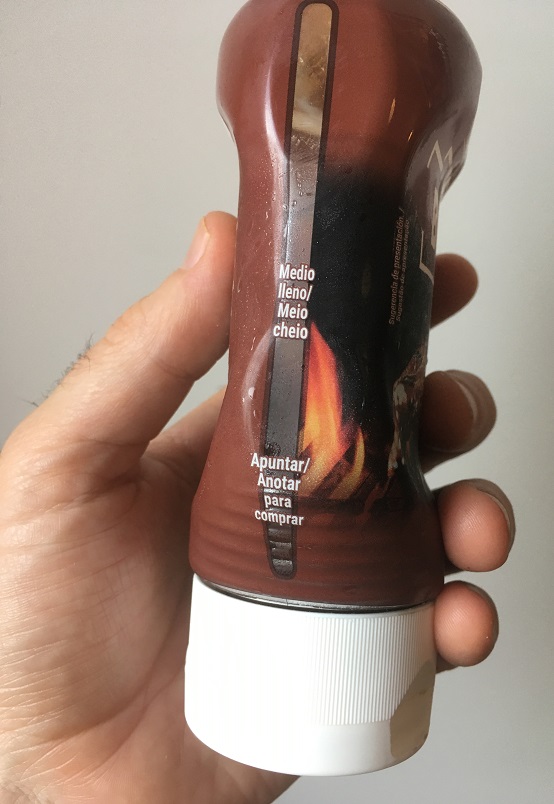 La resposta és la banda transparent que indica el nivell que queda del producte, i la marca “Apuntar para comprar” quan en queda menys d’un 15%. Trobo que és una idea de màrqueting genial. I una explicació perfecta del concepte de “punt de comanda”, que després ho lliguem amb el concepte de “estoc de seguretat”, dins del tema de logística i gestió de mercaderies.
