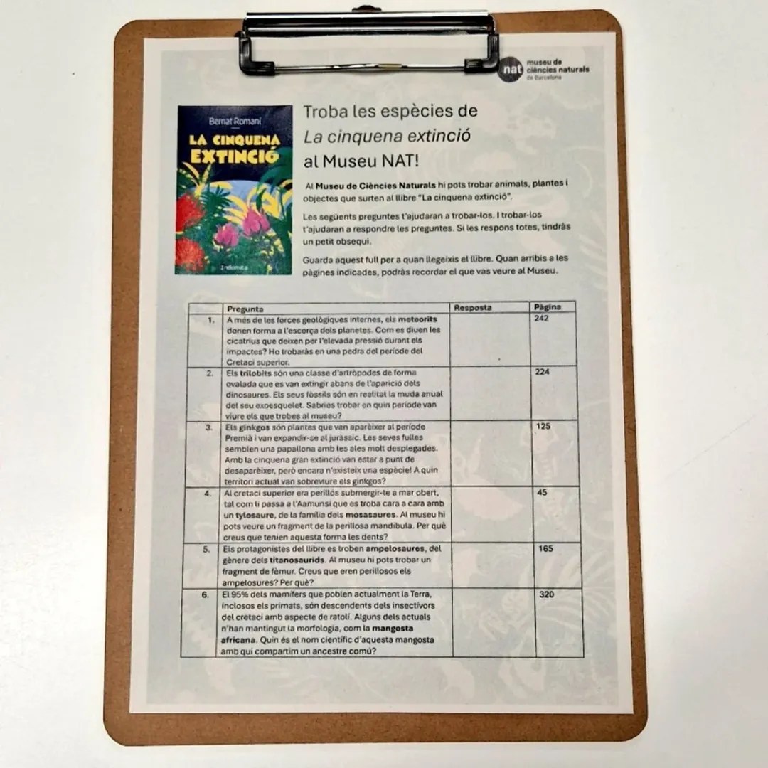 Tant si ja t’has llegit La cinquena extinció com si tens previst fer-ho, t’animo a fer una visita al Museu de Ciències Naturals de Barcelona. Podràs trobar animals, plantes i objectes que surten al llibre dins l’exposició permanent Planeta Vida.